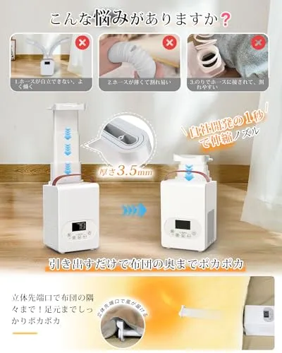 【自社開発!1 秒伸縮ノズル 立体先端】革新的な「瞬間収納デザイン」により、伸縮ホースが 1 秒で本体に完全収納!収納時はホース長さゼロ cm、まるで消えたかのようにスマートに片付きます。必要な時は簡単に引き出して、布団の奥底まで温風を届けることができます。3.5mm の厚肉構造で耐久性が 200%向上し、長期間の使用にも頑丈に対応します。さらに、立体ノズルに内蔵のホルダーを展開するだけで、布団内に確実な空間を形成!偏らず熱が行き渡り、ポカポカ快適な乾燥体験を実現します。使い勝手と機能性を