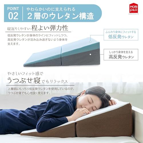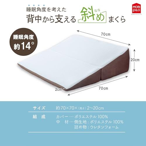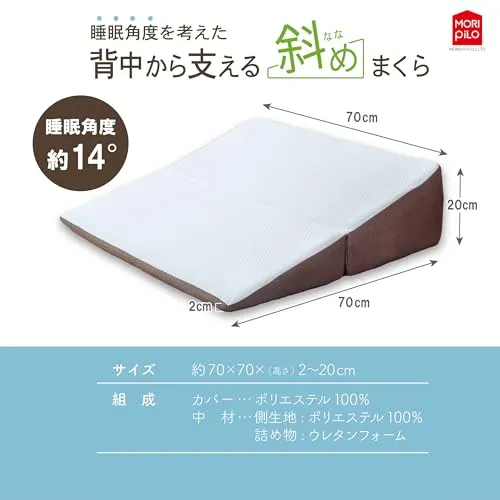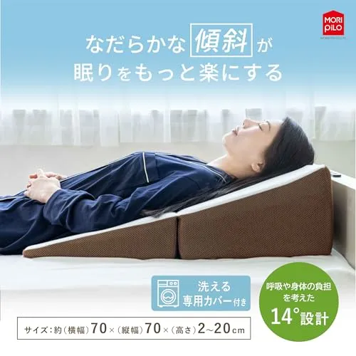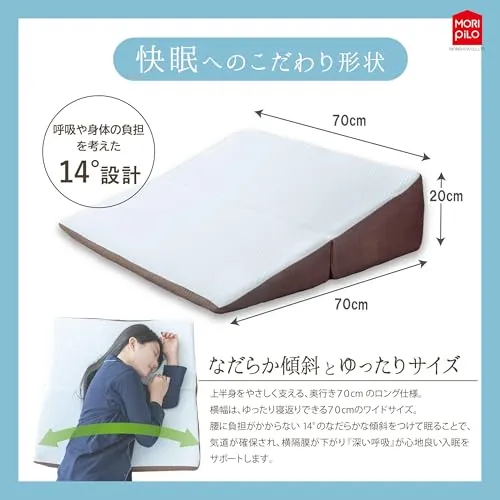 【逆流性への物理的アプローチ】上半身を高く保つ14度の傾斜が、食後のリラックスタイムをより快適に。無理のない角度が、横になった際の不快感や「逆流性」特有の違和感を軽減します。角度を活かした休息の質を提案する、三角クッションまくらです。体型や好みに合わせ、タオルを敷いて高さを微調整することも可能です。