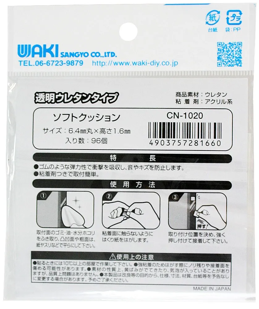 ご覧いただきありがとうございます。 当店では他サイトにも商品を販売しているため まれに売り切れや取り寄せ中となる場合がありますがご了承ください。 Main 貼るだけカンタン 粘着ソフトクッション ドアの衝撃音 キズ防止に 透明タイプで目立たない! 6.4mm丸X高さ1.6mm(96個入り) 材質:ウレタン 最後までご確認頂き誠にありがとうございました。 上記をご確認頂き、ご購入いただけましたら幸いです。 何かご不明な点がございましたらお気軽にメッセージからお問い合わせ下さい。