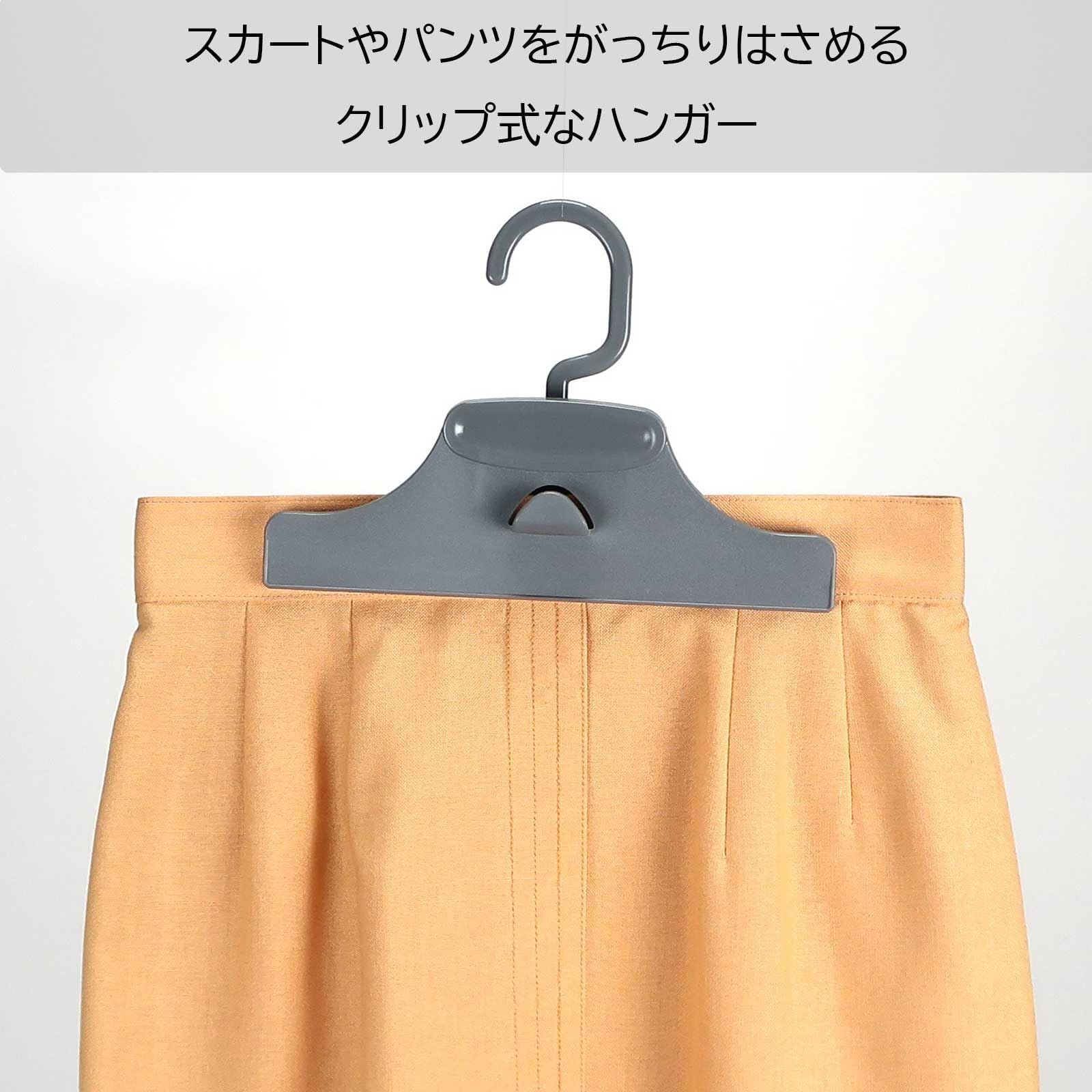 スカートやパンツをがっちりはさめるクリップ式のハンガー。