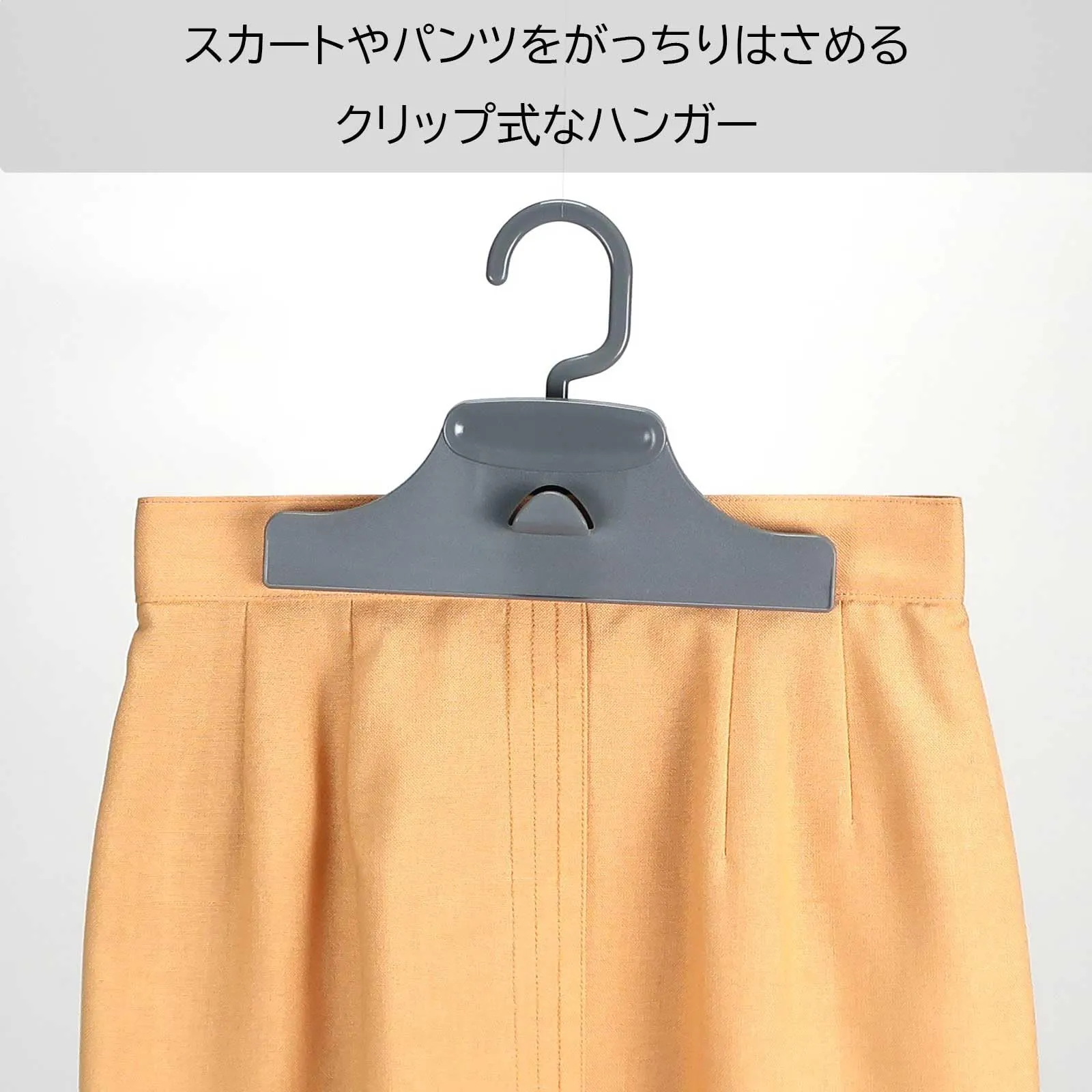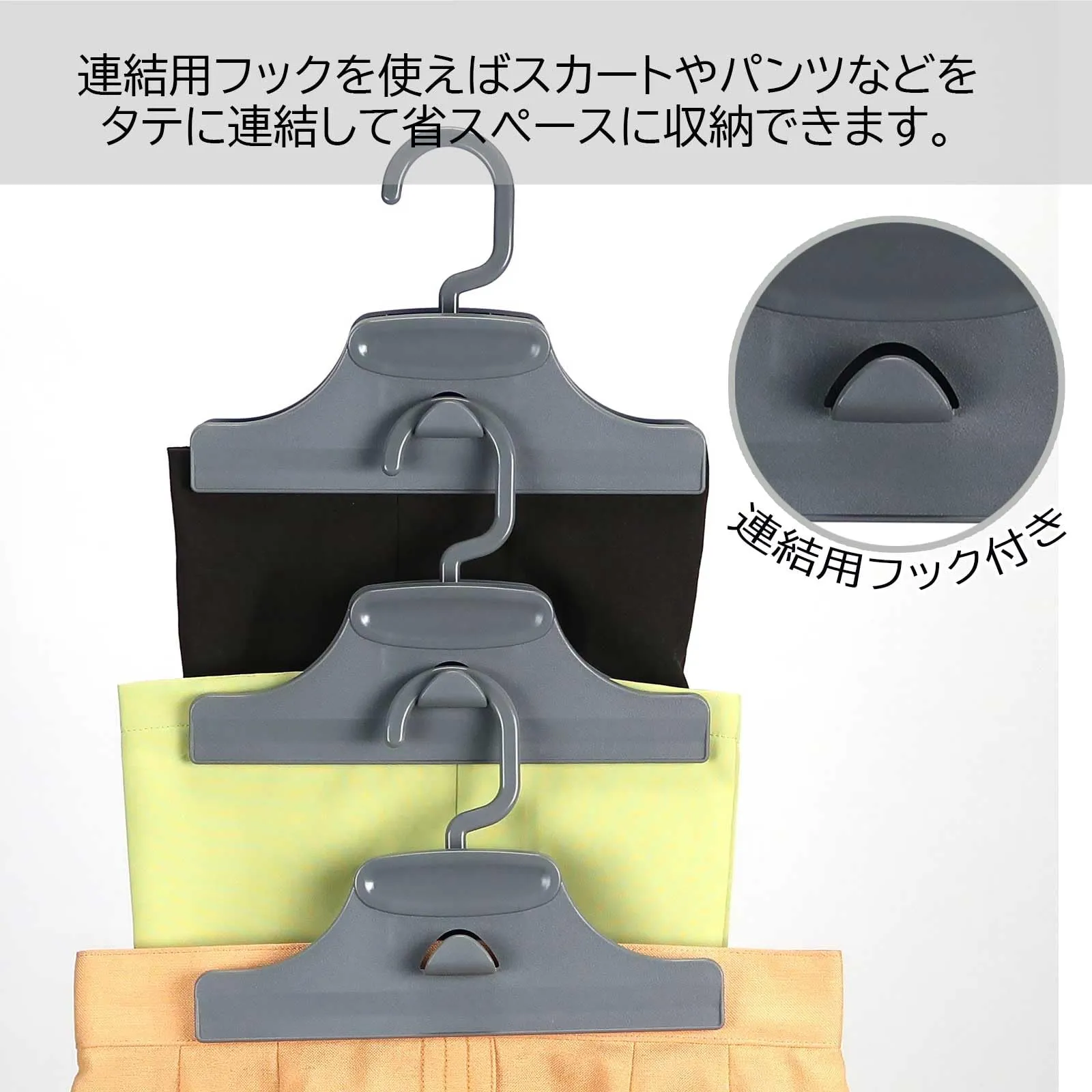 連結用のフックも付いているのでスカートやパンツなどをタテに連結して省スペースに収納できます。