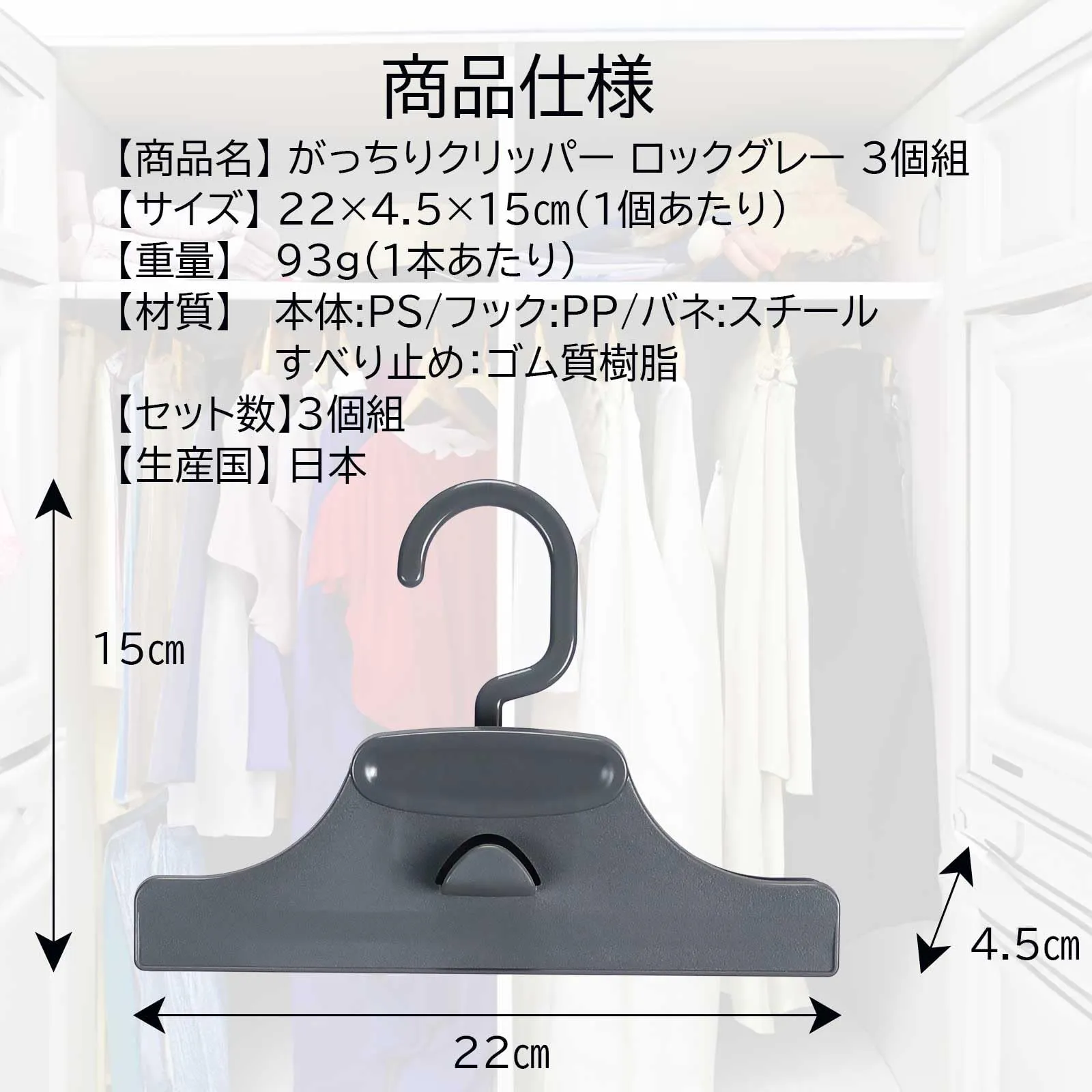 【材質】本体・フック:PP/バネ:スチール/すべり止め:ゴム質樹脂