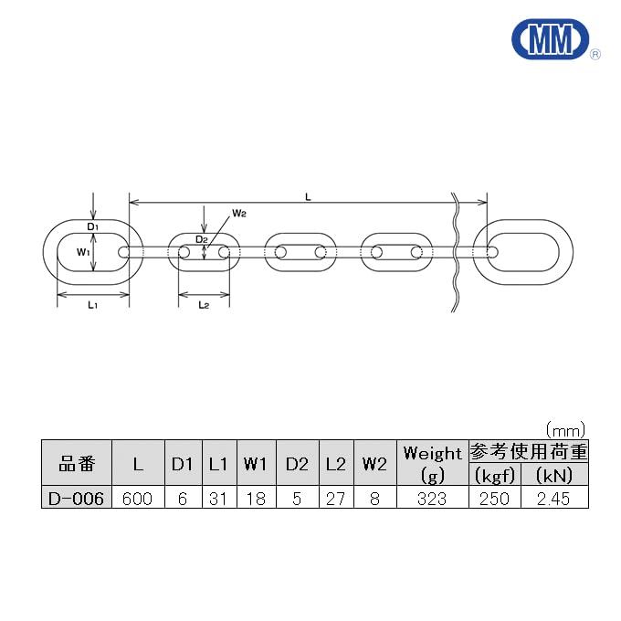 水本機械製作所のステンレスセーフティーミニチェーンD-006は、安全管理や立入制限に最適な高品質チェーンです。両端に楕円リンクを採用しており、1回通して対象物をしっかりガードします。SUS304ステンレス製のため、錆びにくく耐久性に優れ、屋内外問わず長期間使用できます。全長600mm、使用荷重2.45kNで、軽量ながら323gとしっかりとした作りです。寸法はD1が6mm、D2が5mm、L1が31mm、L2が27mm、W1が18mm、W2が8mmと、コンパクトながら実用的なサイズ設計となっています。工場、倉庫、店舗、イベント会場など、様々な場所での安全対策や区画整理にご活用いただけます。ステンレスの美しい光沢が、機能性とともに洗練された印象を与えます。