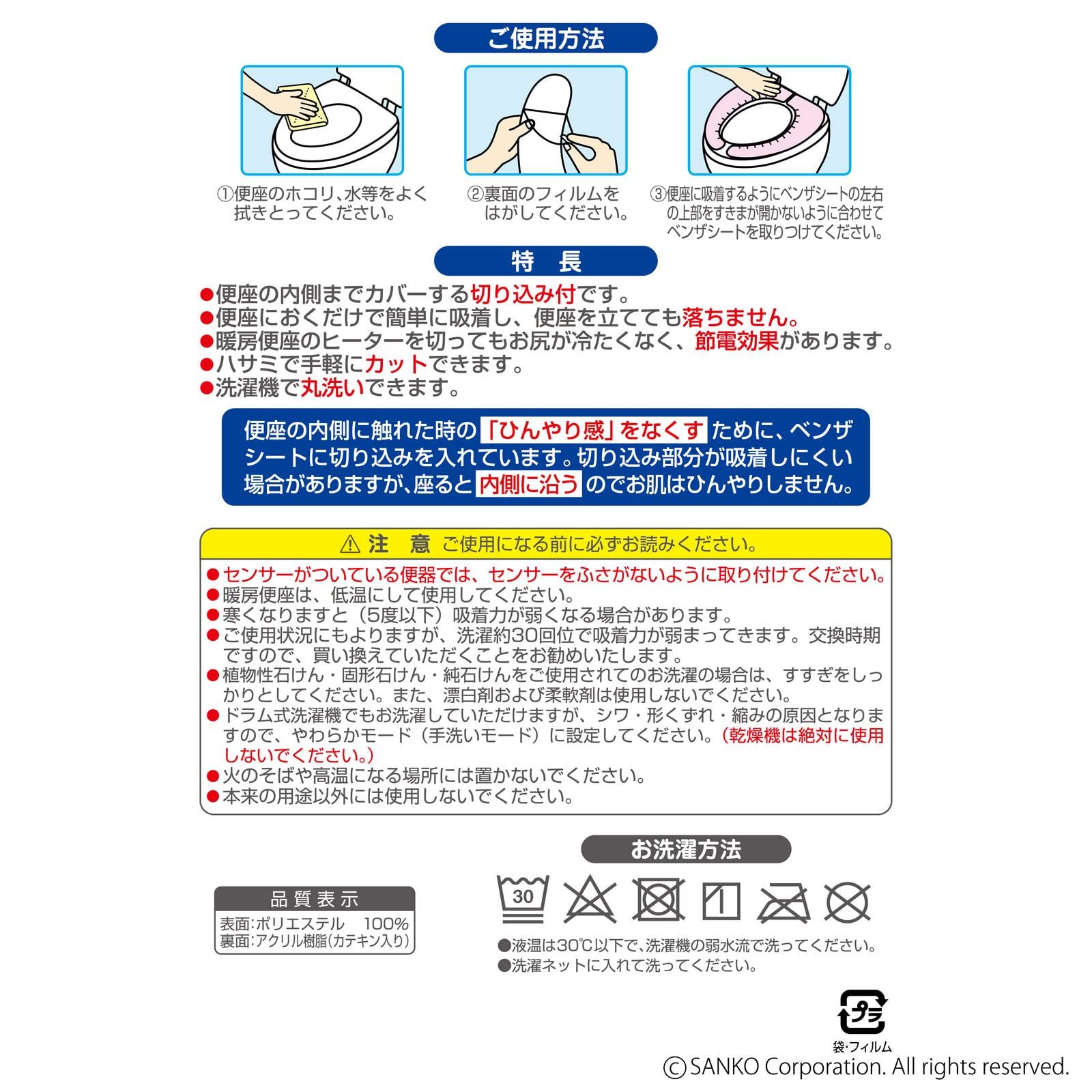 便座に置くだけで簡単に装着できる吸着タイプの便座シートです。面倒な取り付けから解放されます。端を持ち上げれば簡単に外せます。