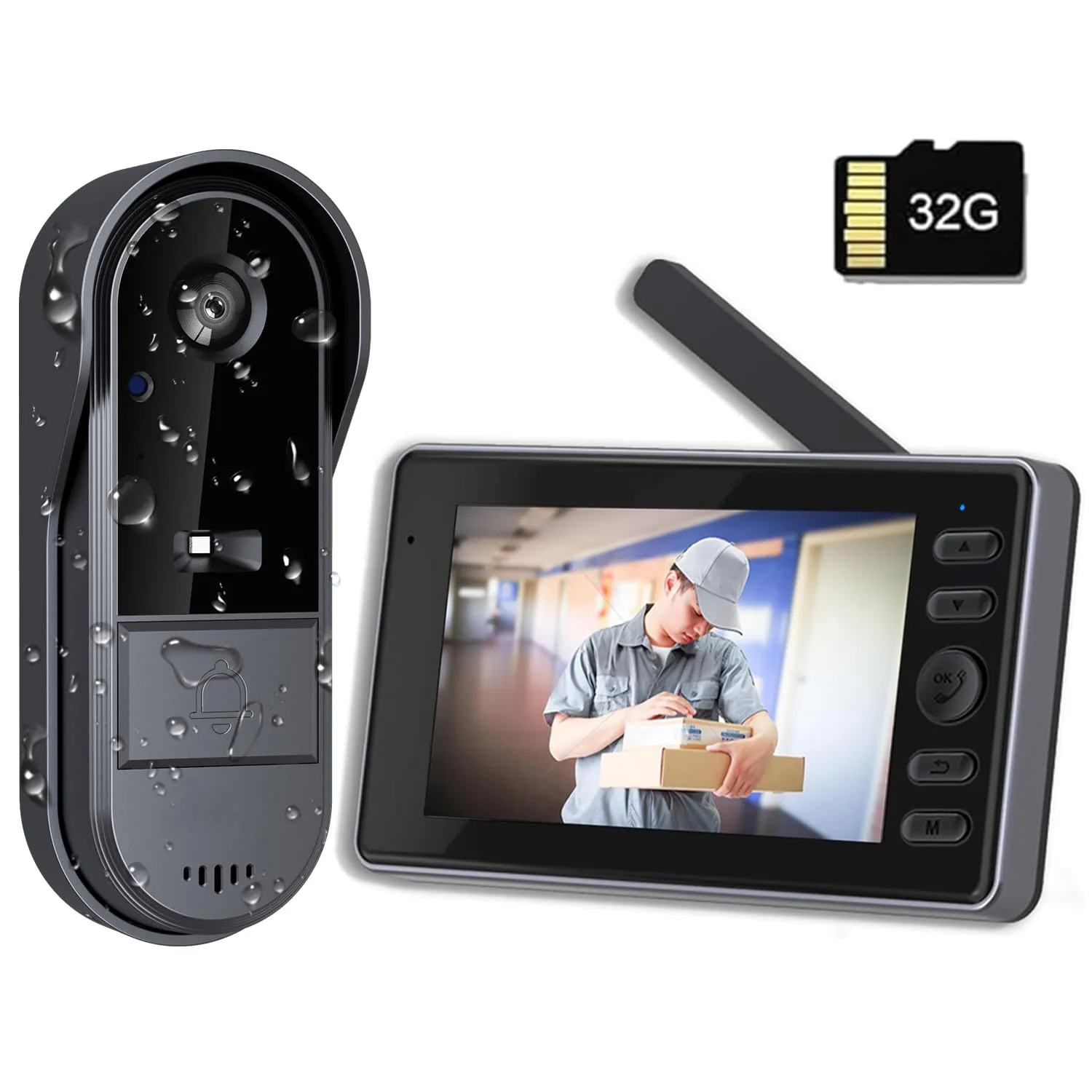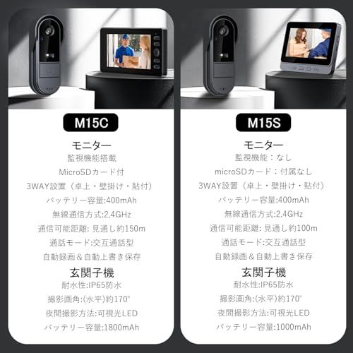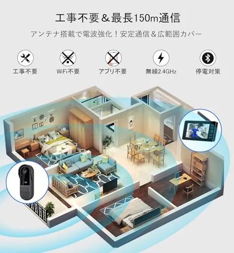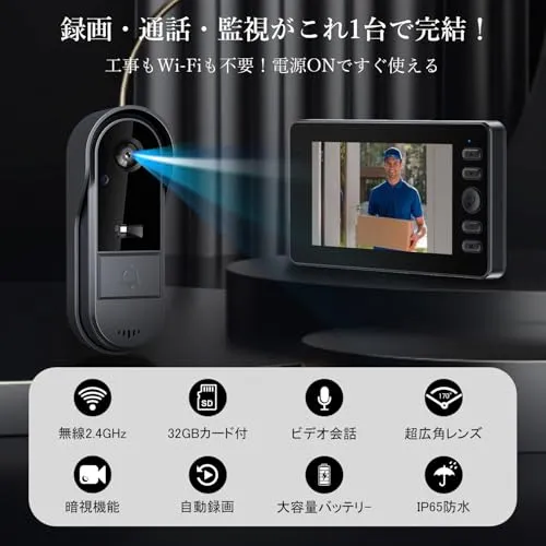 【Wi-Fi接続&配線工事不要・双方向通話】親機と子機は出荷時にペアリング済みで、Wi-Fi接続や面倒な配線工事は一切不要。電源を入れるだけで、誰でもすぐに使用可能なワイヤレスインターホンです。双方向通話機能付きで映像を確認しながら来訪者とリアルタイムで会話が可能。付属の32GB microSDカードで長時間の録画に対応し、容量がいっぱいになると自動で古い映像から上書き保存。