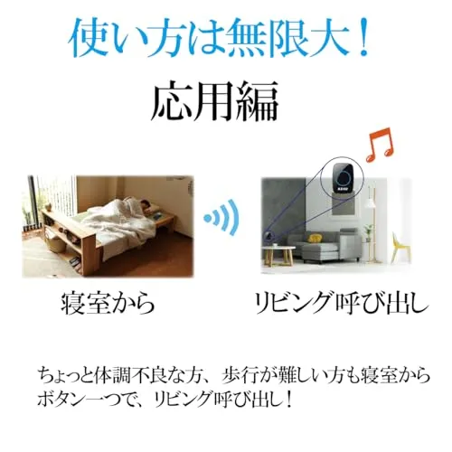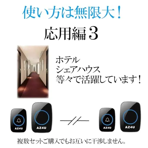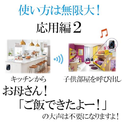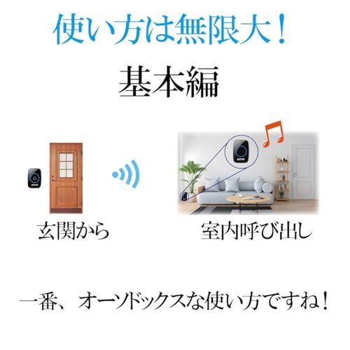 【返品・交換について】 商品に不備があった場合は、評価前にご連絡ください。 内容を確認のうえ、誠実に対応させていただきます。 最後まで気持ちの良いお取引ができるよう努めてまいります。 どうぞよろしくお願いいたします。 ワイヤレスチャイム: 即日使用可能で配線工事不要な便利なワイヤレスチャイム。コンセント不要で設置場所が自由に選べる。技適マーク取得済み 無線転送距離: 最大300Mの広範囲に信号を送信(ベストエフォート) メロディ: 60種類のメロディから選択可能で、ピンポン音だけでなく豊富な音楽を楽しめる 音量調整: 4段階の音量調整が可能で、環境に合わせて音量調節可能。無音、発光のみも可能 簡単取り付け: 玄関に両面テープやネジで簡単に取り付け可能 電池式: 受信機は電池で動作し、単3電池3個(別売り)を使用。発信機は12V23A電池付属(試供品となります。早めにご交換ください。新品の電池の場合は3年ほど持続する仕様ですが、環境によって1年程度になる事もございます。) 干渉しない: ワイヤレスチャイムを複数セット購入してもお互いに干渉せず、安心して使用できる 多様な用途: シェアハウスやおうちの中での呼び出しに最適で、様々なシーンで活用可能。玄関用に玄関呼出しや起き上がりにくい方の呼び出し、呼び出しベルとして子供部屋へのごはんコールなどに最適 防水設計: IPX4級防水で屋外でも安心し