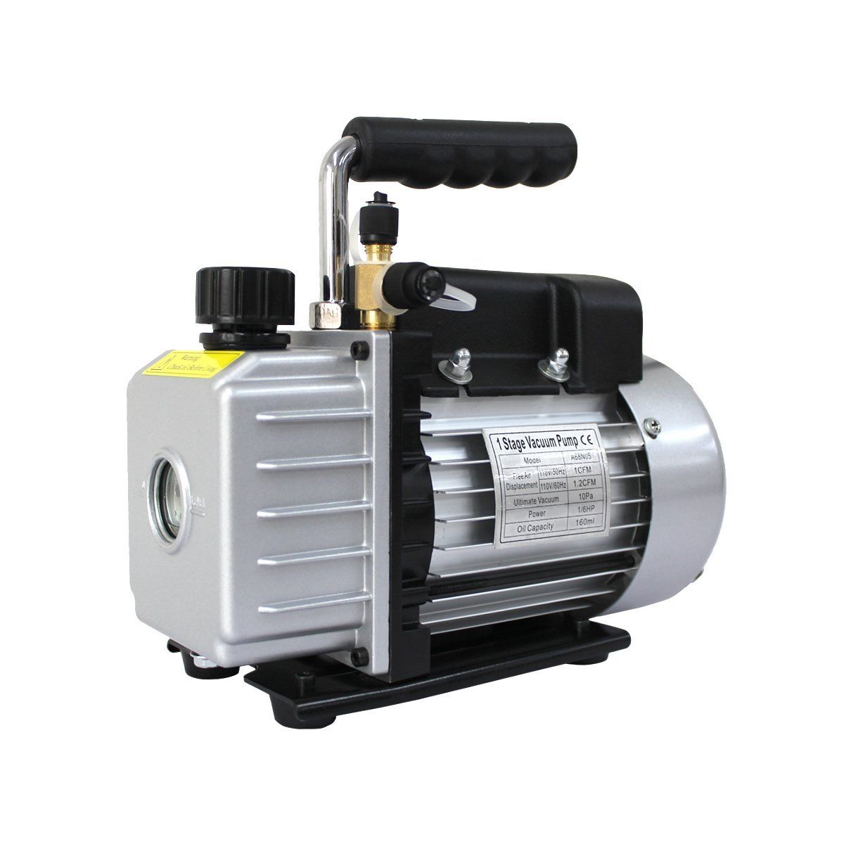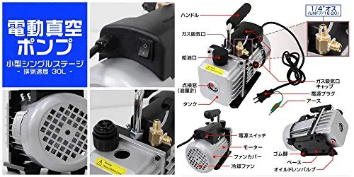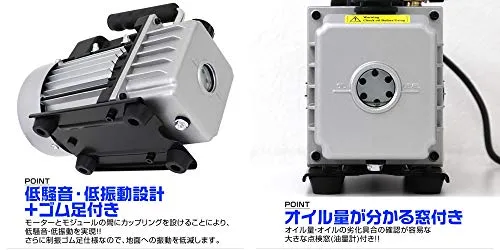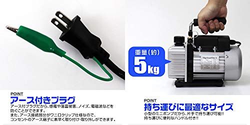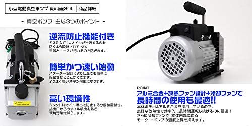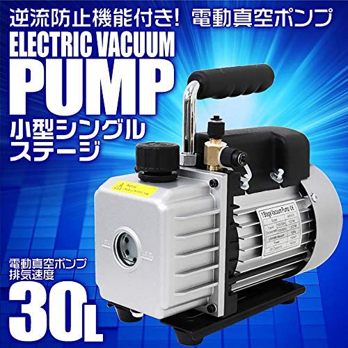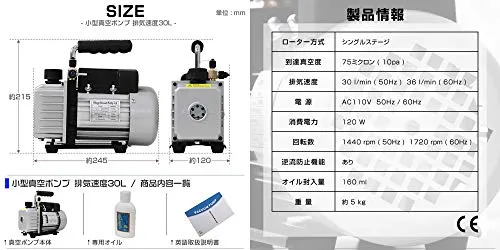【商品仕様】ローター方式:シングルステージ式 / 到達真空度:75ミクロン(10pa) / 排気速度:30l/min(50Hz)、36l/min(60Hz) / 電源:AC100V(AC110V)50Hz/60Hz / 消費電力:120W / 回転数:1440rpm(50Hz)、1720rpm(60Hz) / 吸気口径:1/4"フレア(UNF7/16-20) / サイズ:12 x 24.5 x 21.5 cm / 重量:約5kg / 逆流防止:あり / オイル封入量:160ml