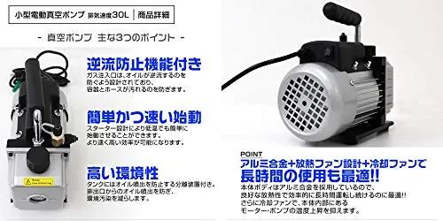 小型で使いやすい電動真空ポンプ(排気速度30L/S)です。カーエアコン、家庭用エアコンの真空引きに対応できます。オイル逆流防止機能がついているのであらゆる冷媒に対応しており、幅広い用途に使えます。R12、R22、R134a、R502などに対応。