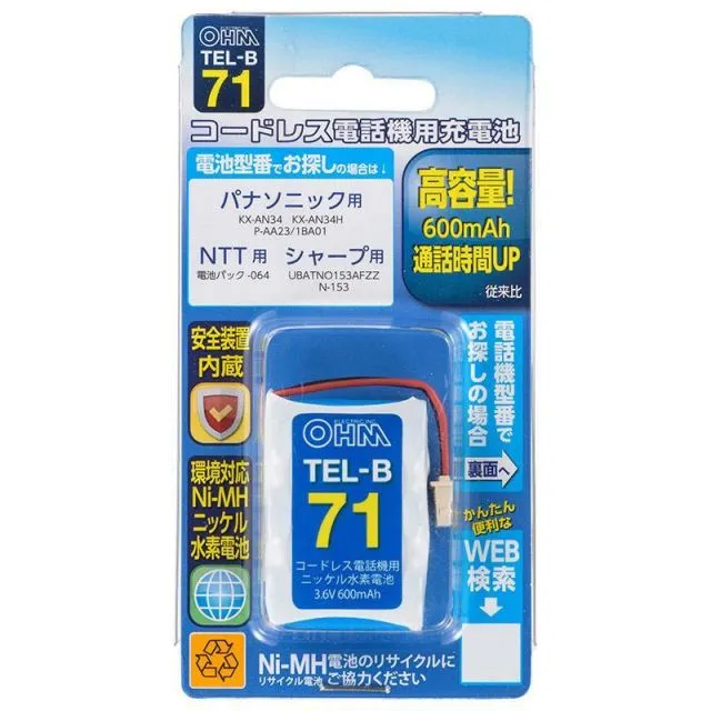 商品名:OHM コードレス電話機用充電池 高容量タイプ TEL-B71