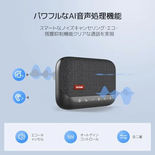 「パワフルなAI音声処理機能・スピーカーフォン」Nuroum A15がエコーキャンセリングや残響抑制、ノイズリダクションと音声最適化AGC機能を採用しており、よりクリアとスムーズな通話を実現しました。エコーキャンセリング機能より、スピーカーから出る相手の声をマイクが拾ってしまうことで起きるハウリングを抑えて、音声がクリアに聞こえるようにします。ノイズリダクション機能も搭載され、周囲の環境騒音などの雑音を軽減・除去してクリアかつ自然な音声で通話できます。オートゲインコントロール(AGC)機能により、人声を話者の位置に関わらず均一に音声を最適化に伝えられます。独自の高音質技術を採用したNuroum A15がお互いのコミュニケーションを円滑に行うため欠かせないアイテムです。