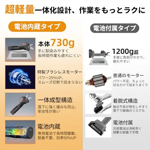 【超軽量・現場で戦える電動鋏】外付けバッテリー式の多くは、バッテリー本体の重さが加わり、長時間の使用で腕や肩に負担がかかります。当製品は7.2V高出力モーターを本体に内蔵することで、余計な重さを徹底的にカット。グリップは滑りにくく手にフィットする形状で、長時間の作業でも安定した操作感を維持します。バッテリー交換式と比較