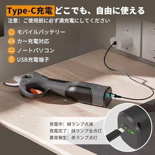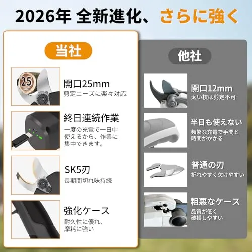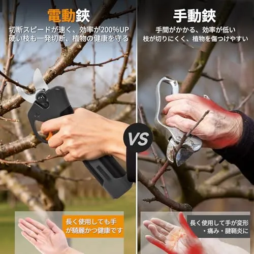 【手動剪定バサミユーザーへ3倍の価格でも「安い」と言われる理由】手動バサミは確かに安価です。でも、使い続けるたびに手首に響く痛み、そしてある日突然「握れない」と気づく絶望??それらは本当に「節約」でしょうか?当製品に変えたお客様からは「腱鞘炎になりかけていたが、信じられないほど楽になった」「手が痛かったのが天国のように変わった」との声が続出。7.2Vのパワーが全ての切断を行い、トリガーに軽く引くだけ。直径25mmの太枝も1秒でスパッと切れ、作業時間は手動の10倍以上。痛みから解放される価値を考えれば、むしろ「安い買い物」だとお客様は口を揃えます。もう、痛みと引き換えの「節約」はやめにしませんか?この充電式ハサミを持つと、もう手動の枝切りバサミには戻れません。