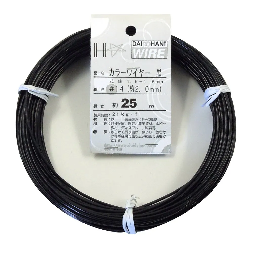 安全耐荷重:21kgf。なまし鉄線にPVC(ポリ塩化ビニール)を被膜した針金です。