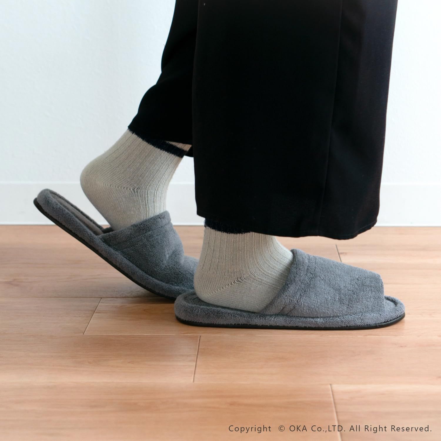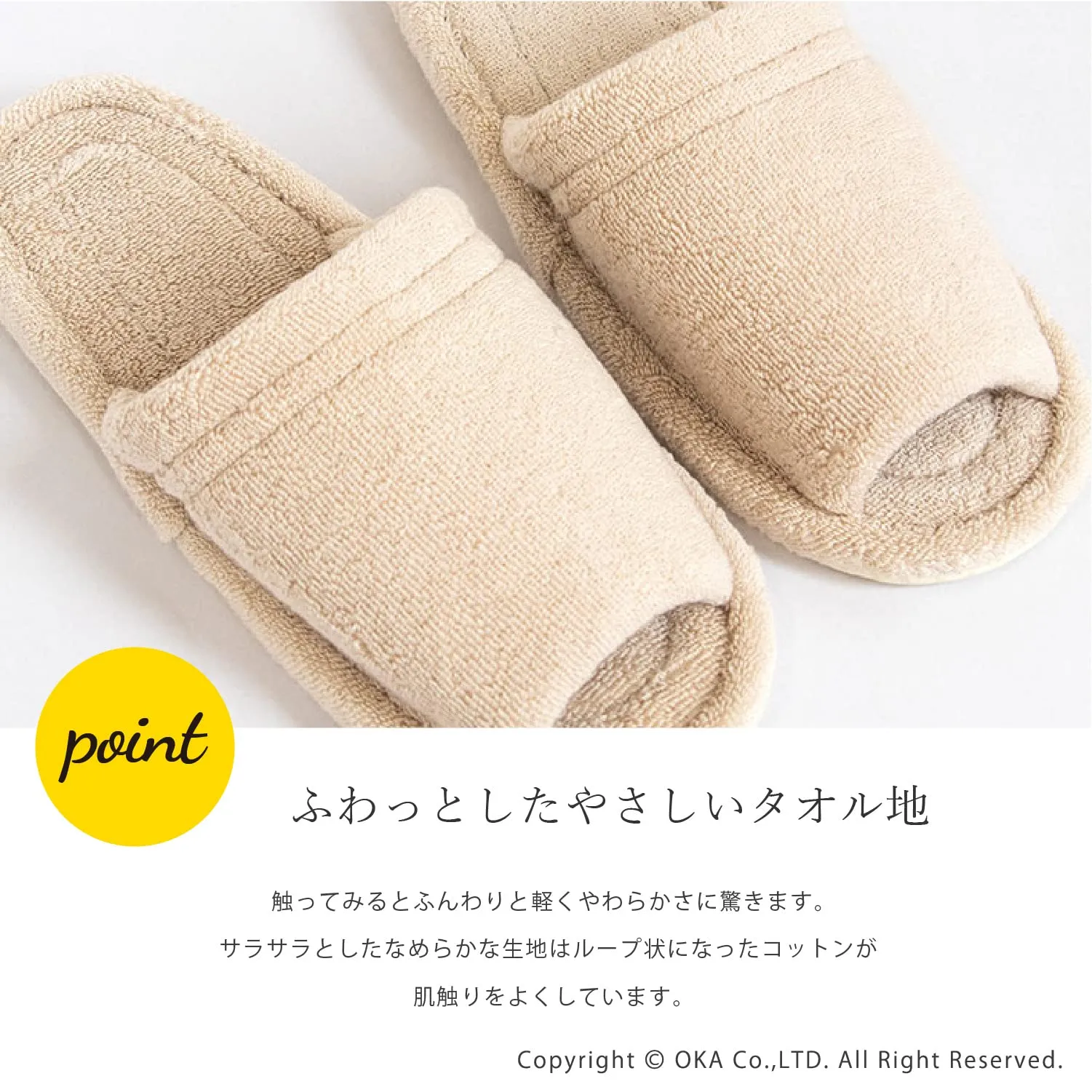素足で履くとそのやわらかさを実感していただけるほど、やわらかな肌触りはループ状になったコットンが肌触りをよくしています。 サラサラとしたなめらかな生地で足の甲が直接当たる部分にもスリッパ全体と同様の生地を使用することでそのなめらかさを感じることができます。 吸湿性もあるコットンは、履いているうちにムレてしまいやすいスリッパも快適にご使用いただけます。