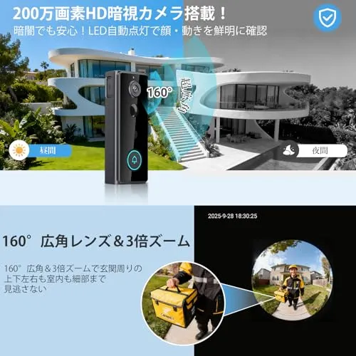 【動体検知・自動録画µSDカード付・アプリで動画再生】自動録画機能付きの玄関カメラはPIRモーションによる警報通知機能を備えており、来訪者のボダン押下や人の動きを検知すると、自動で録画、スマホに通知します。留守中や外出時、夜間など、カメラの前に誰もいない状況でも重要な出来事を見逃すことなく確実に記録でき、付属の32GB microSDカードに映像を保存し、スマホから動画データをいつでも確認可能。大切な映像を保存・管理できますので防犯カメラとしても活躍します。