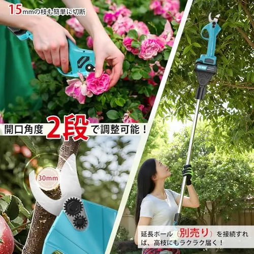 【20mm/30mmの2段階開口幅広いシーンで活躍】切断口径は20mm・30mmの2段階で切替可能。細枝から太枝まで用途に合わせて最適なサイズを選べます。強力な切断機構により最大30mmの枝もスムーズにカットし、切り残しのない美しい仕上がりに。庭木の剪定、果樹園、公園、農場、温室など幅広いシーンで活用できます。
