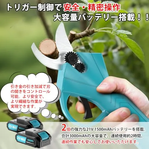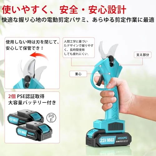 【わずか763gの軽量ボディ負担を大幅軽減】本体は約763g、バッテリー装着時でも約1.1kgの軽量設計。女性やご年配の方でも片手で扱いやすく、長時間作業でも手首や腕が疲れにくいのが特徴です。細かな枝から太めの枝までスムーズに剪定でき、軽快な操作性と作業効率を両立しています。