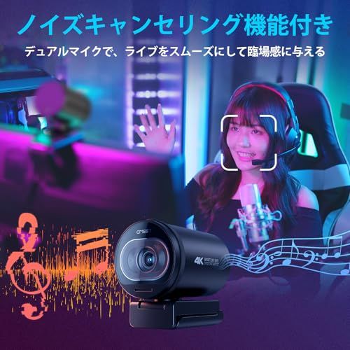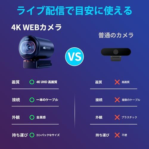 【デュアルマイク付き、73視野角】ウェブカメラはデュアルマイクを内蔵し、360度集音可能で、しっかり声を拾えます。ノイズキャンセリング機能により、周囲の環境音を自動調整し、よりクリアな音声を伝えます。また、視野角は73で、自分に焦点を合わせたり、背景をバランスよく見せたりすることができます。カメラを三脚に固定して授業の録画やライブ配信も可能です。