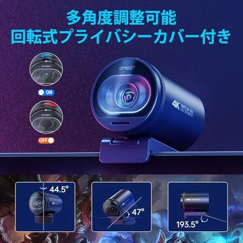 【精巧なデザイン、回転式プライバシーカバー】EMEET S600 webカメラは、クリップやジョイントなどの部分が頑丈に作られしっかり固定されると同時に大角度で柔軟に回転できます。便利なプライバシーカバーはカメラのギアを簡単にフリックするだけでON/OFFできます。従来