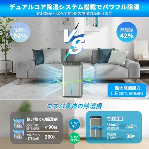 【ダブルペルチェ素子搭載で除湿量は50%UP!】最新の除湿機 小型は従来のシングルペルチェ式製品に比べ、ダブルペルチェ素子を搭載し、空気接触面積が増加して除湿効果が高まり、全体で50%向上しました。 また、1日あたり1000mlの除湿が可能(気温30、湿度80%の場合)。 夏の梅雨時の衣類乾燥・除湿や冬の室内干しに最適、強力な除湿能力で不快な湿気を強力に取り除き、一年中快適な室内環境を実現します!