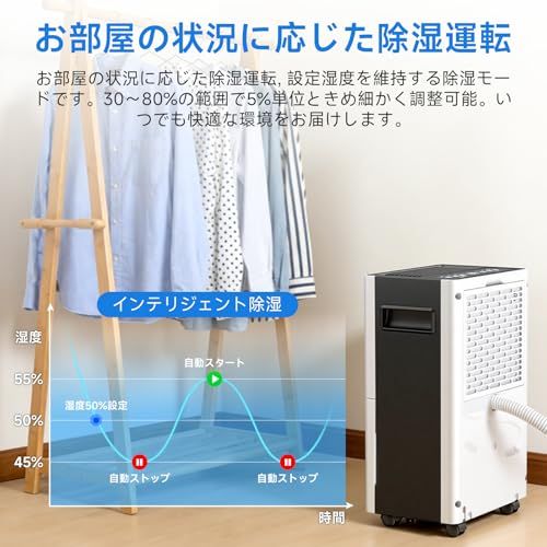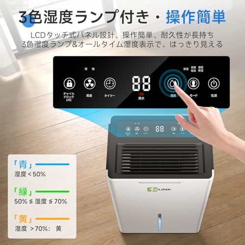 快適操作&充実機能で使いやすい除湿機:除湿機は高精度湿度センサーを搭載し、室内の湿度を自動検知し、環境湿度をリアルタイムで表示します。デジタル数値と三色表示画面でリアルタイム湿度データを表示(湿度50%:青色、50%7