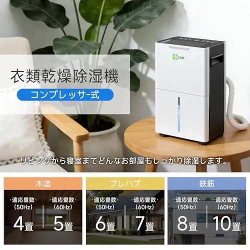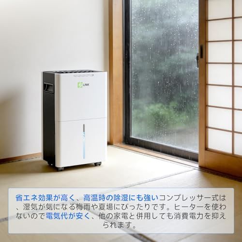 コンプレッサー式除湿機:本格除湿は、高温多湿に強い、暑い夏の日ほど、本来の力を発揮。梅雨夏の本格的な湿気もサラリと快適に。省エネで家計に優しい、高効率コンプレッサー搭載で、電気代をしっかり抑える。一日中つけていても電気代が気になりません。他の家電と併用しても安心です