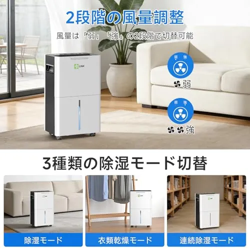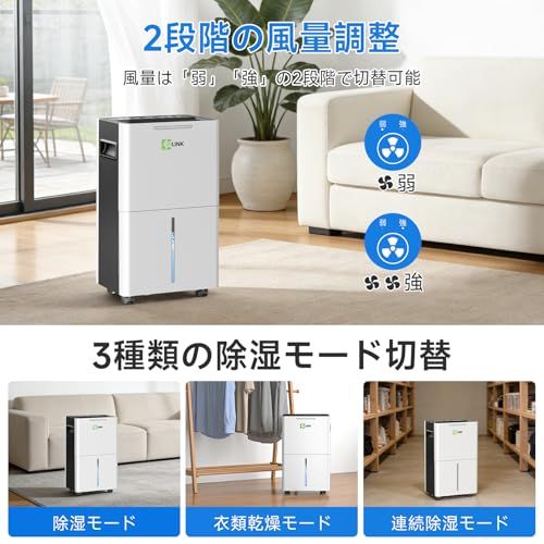 3つの除湿モードで:「除湿」モード:お部屋の湿度をセンサーが感知。30~80%の範囲で5%単位のこだわり設定が可能で、設定した快適な湿度をキープします。「衣類乾燥」モード:衣類乾燥除湿機、洗濯物に直接風を送り、部屋干しでも素早くカラッと乾燥。生乾きのニオイを防ぎ、梅雨時や雨の日も清潔な仕上がりに。「連続除湿」モード:24時間連続運転で、湿気が気になる場所やシーンでも、しっかりと高い除湿効果を発揮します