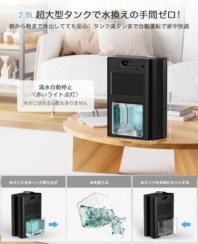 【2800ML大容量水タンク・満水自動停止】業界トップクラスの2.8L透明タンクを採用。前後の水位チェック窓で、水の増加量を二重に確認可能。満水時は赤LED点滅警告ブザー自動電源オフが連動作動し、就寝中や外出時の水漏れリスクを完全遮断。タンク取出時も2段階安全システムが作動???運転中に外すと即時警告音発令 ?35秒後に完全停止??というユーザーフレンドリー設計。さらに収納時はコンパクトに折り畳める省スペース設計で、キッチン隅や洗面台下の狭い隙間にもスムーズ収納できます。