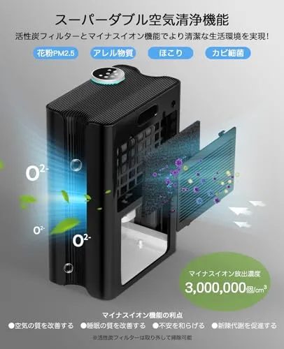 【高濃度マイナスイオン機能・活性炭フィルター】除湿器にはマイナスイオン発生器が内蔵されており、300万個/cm?の高濃度マイナスイオンを放出でき、空気中のプラスイオンと結合し、浮遊粒子を重くして沈降させることで、空気を浄化します。また、空気中の細菌やウイルスを抑制し、室内空気の質の改善にも役立ちます。一方、活性炭フィルターは多孔質構造により空気中の有機化合物、化学物質、臭気などを吸着・固定し、空気をより新鮮に!2つの組み合わせで、湿気によるカビ・結露・臭いなどのさまざまな悩みを一気に解決!