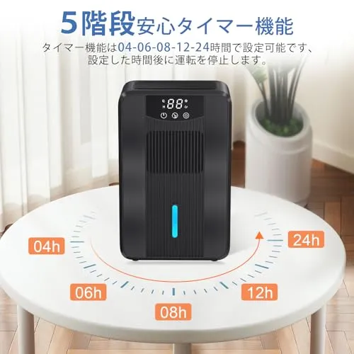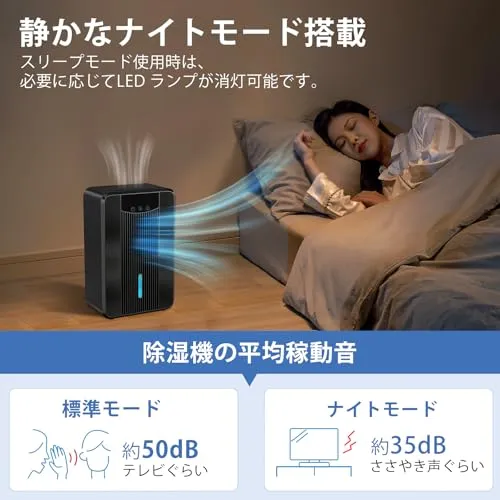 【5階段安心タイマーを付き】タイマーは4・6・8・12・24時間に設定することができます、設定した時間後に運転を停止します、就寝や外出の際にも重宝に使用可能です、無駄な電気代の心配がない。ナイトモードで、除湿機の操作音はわずか40dB、寝室や子供部屋に置いてもほとんど気にすることもなく快適に眠ることができま