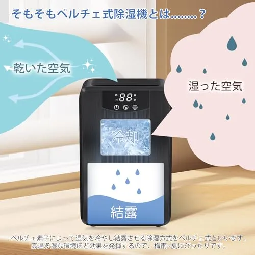 【ペルチェ除湿機、高効率除湿可能】ペルチェ素子によって湿気を冷やし結露させる除湿方式をペルチェ式除湿機です。1000ML大容量排水タンクが搭載され、一日あたりの除湿量はなんと500mlです(室温30、湿度RH80%の場合)、長時間連続使用可能。梅雨や夏場の高温多湿の時期に、冬の結露時などに活躍し、カビや湿気、結露の問題を一挙に解決します。