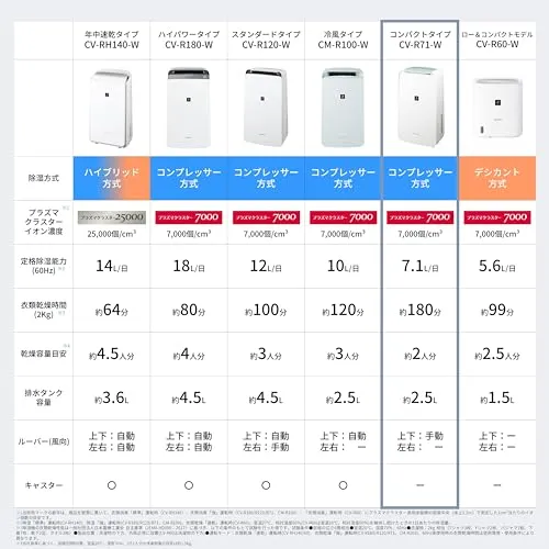 シャープ 衣類乾燥 除湿機 CV-R71-W コンプレッサー 方式 7.1L/日 コンパクトタイプ プラズマクラスター7000 省エネ 部屋干し 消臭 国内発送