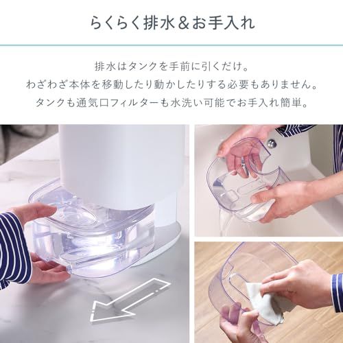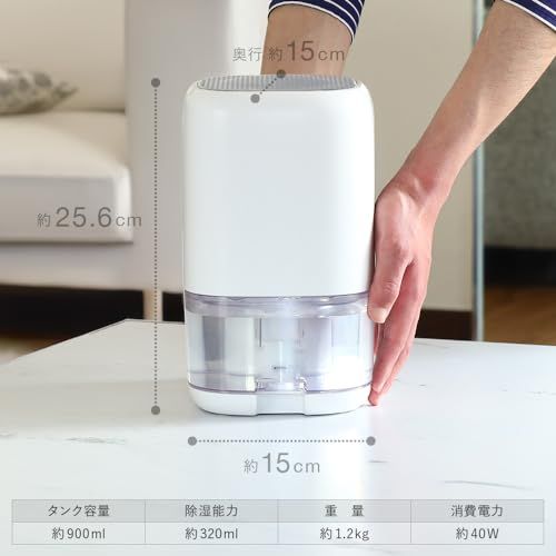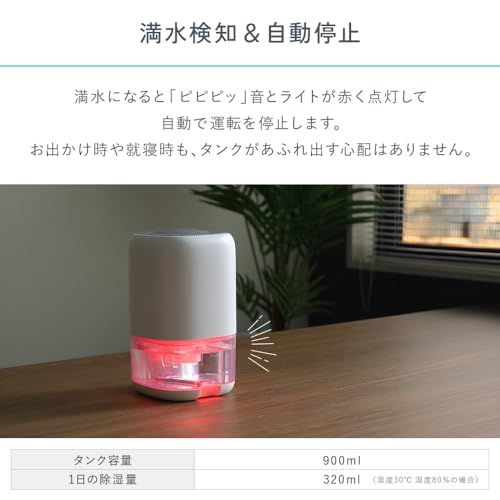 【満水時 自動オフ機能搭載】 排水タンクが満水(900ml)になると自動停止装置が作動し、電源ボタンが点滅して運転を停止します。 ランプが点滅したら、タンク内に溜まった排水を捨ててください。 手前に引くだけでタンクを取り出せ、溜まった水も簡単に排水できます。※タンクは水洗い可能となります。