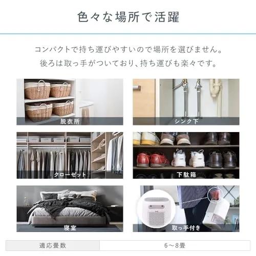 【今どきの湿気対策は?二刀流"!昼間はリビングで使用し、夜は寝室に移動させたり。お部屋クローゼット、どこでも年中快適に】 リビング、寝室、子供部屋、クローゼット、脱衣所など家中の湿気を解決! インテリアにも調和するシンプルかつコンパクトな除湿機です。 付属の電源ケーブルをご家庭のコンセントに差し込み、スイッチを入れるだけで除湿スタート。 お部屋に一台、クローゼットの中に一台と複数台を併用することで年中快適に過ごすことができます。