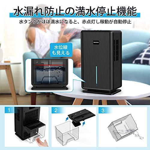 【水漏れ防止&自動停止&メモリー機能&7色雰囲気ランプ】除湿機タンク内の水が溢れないようにほぼ満水になったら自動的に運転停止になります。更に利用便利のため、利用設置を知能的に復帰、そして運転し続く、もう一度設置の手間がかからない。また、7色雰囲気ランプも付き、気持ちよく雰囲気を作って快適に。*ご注意: ?衣類乾燥用できない。 ?タイマー機能が無い。 ?温度0以下の環境条件での使用を進め無い
