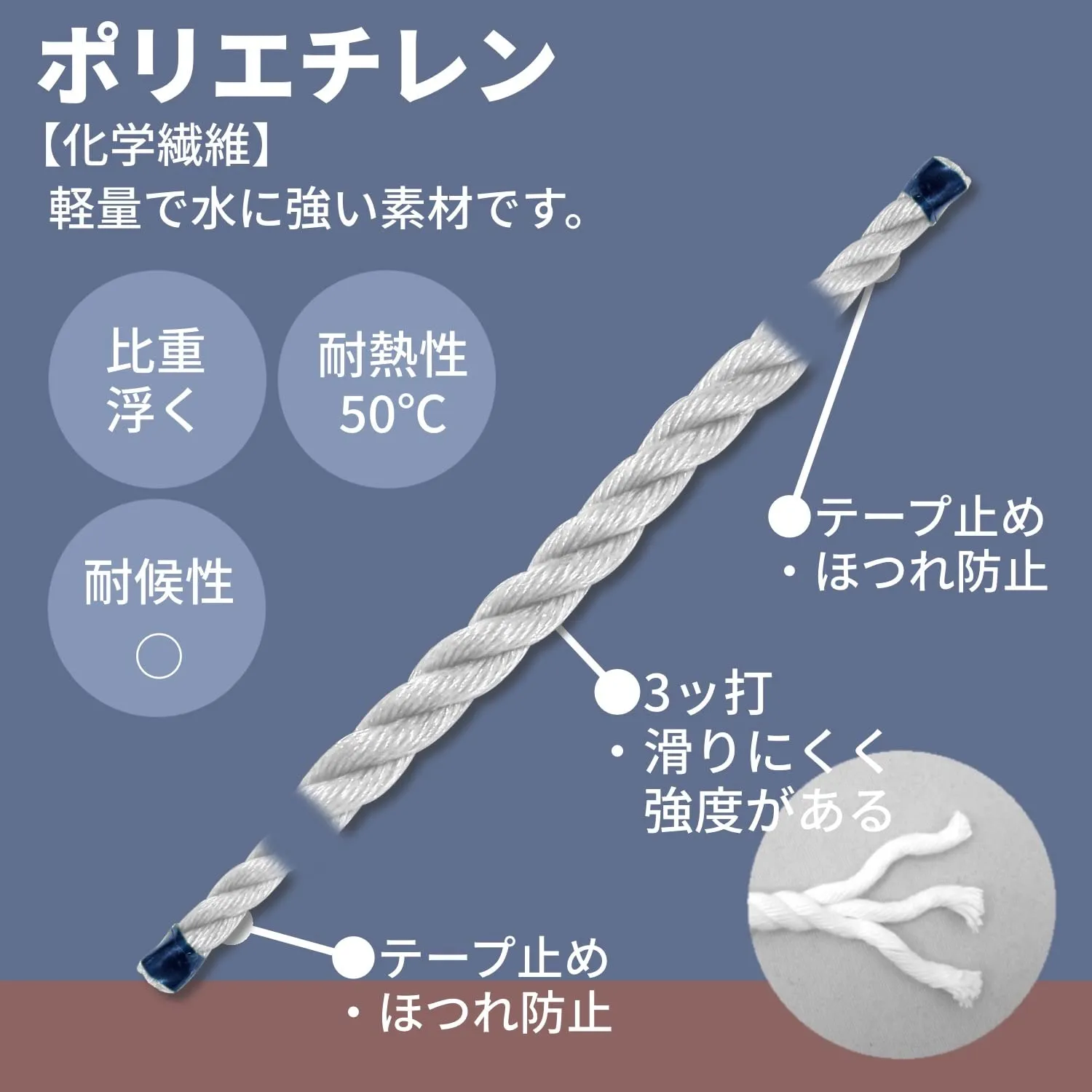 【軽量・強力】ポリエチレンロープは軽量で水に強く、ショックにも強いロープです。またロープ表面は硬くて滑りやすいという特徴があります。
