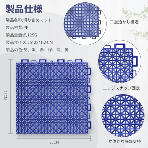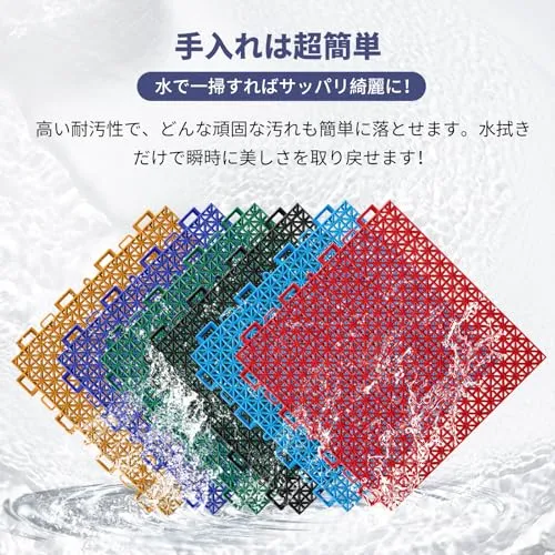 高機能水はけ構造:水はけマット 屋外として、特殊な連結構造が排水をスムーズに導き、雨の日でもベランダが水たまりにならず。水はけマットの特性を活かし、屋内(例:浴室)での使用にも対応し、湿気を防ぎます。