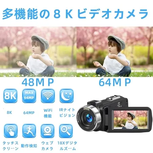 【8Kビデオカメラ&WIFI機能&IRナイトビジョン】Wifi機能でスマホやタブレットと連携できるので、本体から離れた場所から、携帯に動画送れますし、本体を制御したり画像チェックができます。面倒な設定も少なく、操作も簡単です。Wifi機能の具体的な操作方法は取り扱い説明書を参照してください。8Kビデオカメラの基本機能はすべて内蔵されていますので、練習機として最適です。IRナイトビジョン付き、暗い環境でも鮮明に記録できます。基本的な機能以外に、