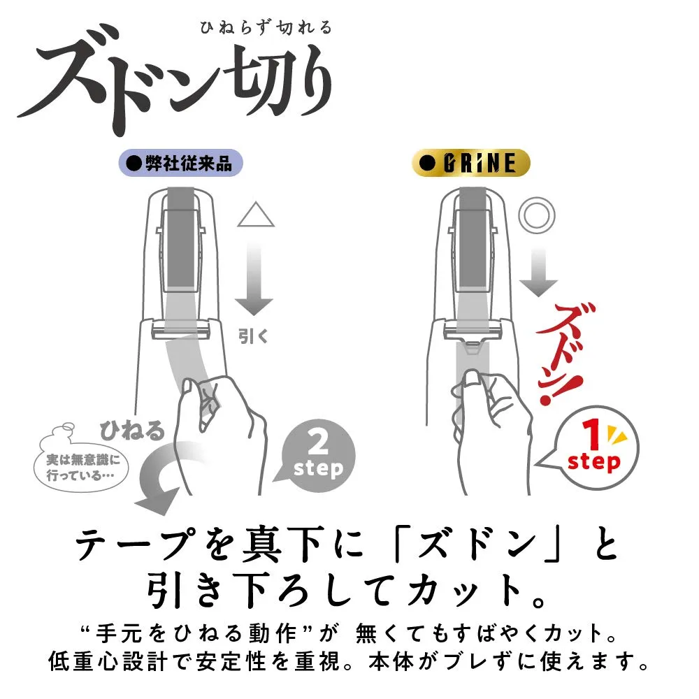 従来のテープカッターでは必要だった“手元をひねる動作”が無くても「グライン」はすばやくカットできます。
