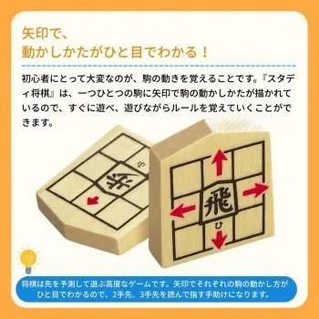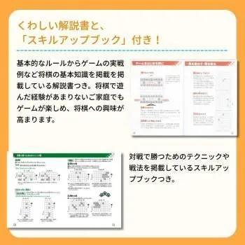 駒の動かし方が分からない初心者でもすぐに将棋が楽しめ、遊んでいるうちに自然とルールが覚えられるアイデア将棋。駒が進む場所が書き込んであるオリジナルデザインの駒と、盤、駒ケース(駒台兼用)がセットされています。将棋の基礎知識が掲載された「解説書」と、対戦で勝つためのテクニックや戦法が掲載された「スキルアップブック」付き!