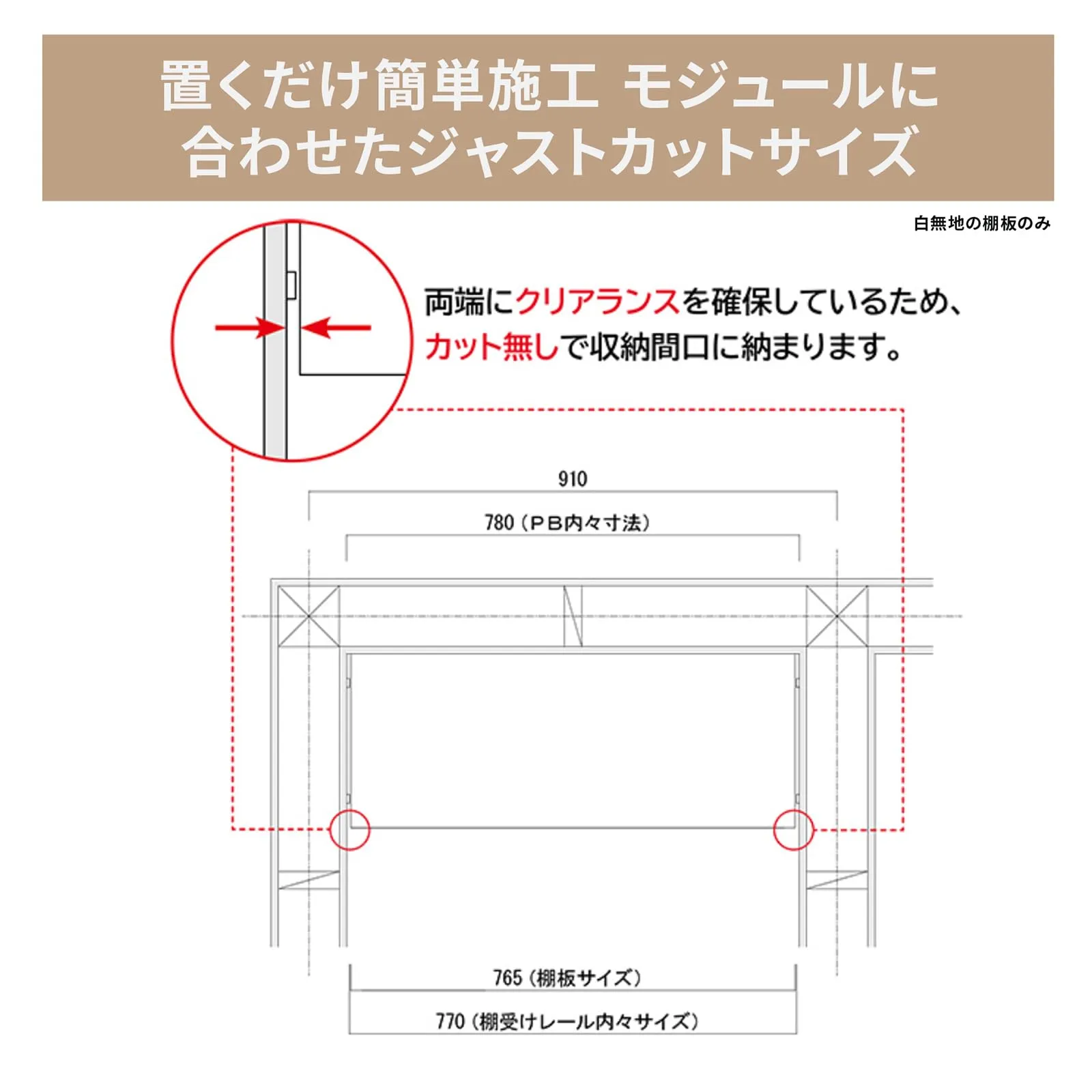 収納内部で使われる壁ともなじみの良いホワイト色。棚受け内々寸法に合わせたサイズをラインナップ。スッキリとして清潔感もあるので、サニタリーにもおすすめです。