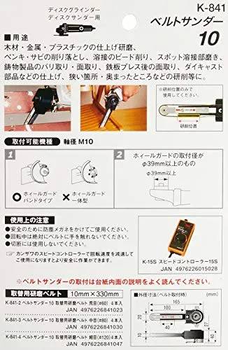 安心してお取引いただけるよう、丁寧に梱包のうえ発送いたします。 荒目#60・中目#80・細目#120 替ベルト各1本付 取付可能機種:軸径M10のディスクグラインダー・ディスクサンダー 別売:・K841-2 替ベルト荒目#60 ・K841-3 替ベルト中目#80 ・K841-4 替ベルト細目#120 ベルトサイズ:幅10mm全長330mm グラインダーでは困難だった手狭な場所、奥まった場所の研磨に最適です。
