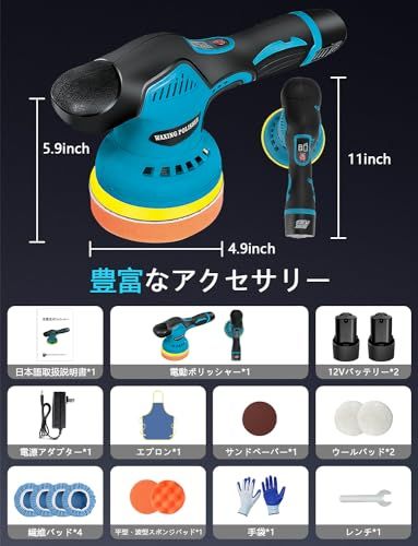 充実の付属品:充電式ポリッシャー本体、12V 1.5Ahリチウムイオンバッテリー2個、充電アダプター、エプロン、手袋、波型スポンジパッド、平型スポンジパッド、サンドペーパー、ウールパッド2枚、タオルカバー4個、日本語取扱説明書が含まれています。市販のΦ125 Φ150 mmの研磨パッドに対応しています。不具合があれば、無料で交換いたしますので、安心してご購入ください。