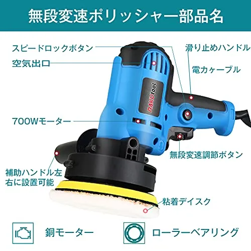 【六段変速可能】六段変速機能が搭載し、従って正確な表面材料および仕事の適用に合うために適当な速度を選ぶことができる変速電動ポリッシャーです。金属などの研磨作業・車の研磨とワックス・木工・塗装はがし、金属製品の錆落しなど様々な要求に満たします。低速度で低騒音、高速度で高効率に作業できます。