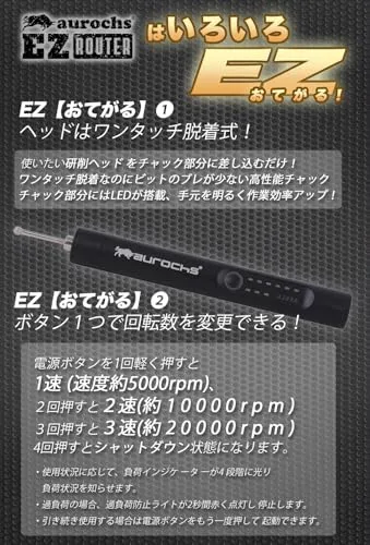 【おてがる】 ヘッドはワンタッチ脱着式! 使いたい研削ヘッド をチャック部分に差し込むだけ! ワンタッチ脱着なのにビットのブレが少ない高性能チャック チャック部分にはLEDが搭載、手元を明るく作業効率アップ!