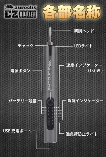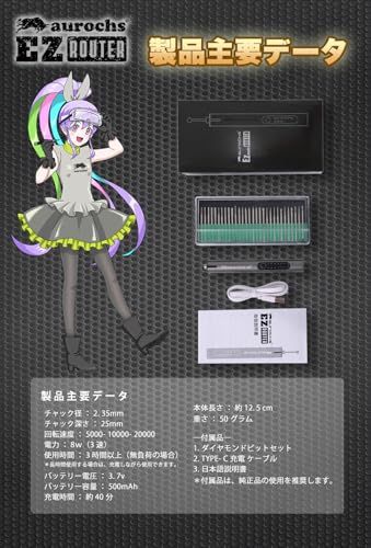 【おてがる】 軽量設計50g、 軽くて長時間作業も疲れない!製品主要データ チャック径:2. 35mm チャック深さ:25mm 回転速度:5000- 10000- 20000 電力:8w(3速) 使用時間:3時間以上(無負荷の場合) *長時間使用する場合は、充電しながら使用できます。 バッテリー電圧:3. 7v バッテリー容量:500MA 充電時間:約40 分 重さ:50 グラム