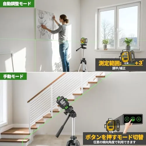 【自動調整・手動モード&環境の変化に応じて明るさ調整可】自動調整・手動モードを切り替え可能。自動調整モードでは、傾き範囲3以内であれば、自動的に自動的にレーザー光を水平に補正します。表傾きが補正範囲を超える場合、アラームが鳴ったり、レーザー光が点滅したりして、ユーザーに知らせます。手動モードの場合は傾斜面への投射が可能で汎