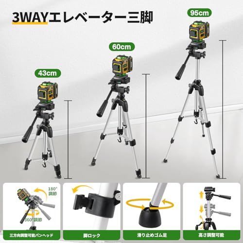 【高精度・見やすいライン】4x36016ライン エレベーター三脚付き リモートコントロール 3.6Ah大容量バッテリー2個セット 電量LCDディスプレー搭載 IP54防水防塵 自動補正 受光器対応 建築現場 DIY yellow 国内発送
