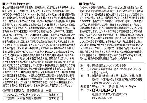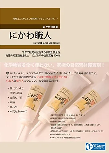 安心してお取引いただけるよう、丁寧に梱包のうえ発送いたします。 床材張り 塗布量目安 3.5/本(100g/) 適度な粘度が有りタレが少なく使いやすい。 接着面の浸透性及び密着性良好。 接着後の強度良好。 接着後の加工が容易であり尚且つ、加工用機械、工具類を傷めにくい。 抗菌・防カビ作用有り。(科学的防腐剤は一切使用しておりません。) 素地の呼吸を妨げない。 ホルムアルデヒド放散等級告示対象外