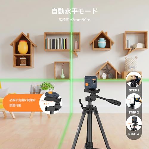 視認性抜群:グリーンレーザーは赤色レーザーに比べて約4倍明るいので、視認性が抜群です。0.3mm/mの高精度を誇り、細かい作業にも対応できます。壁掛け、棚設置、タイル張りなど、正確な位置合わせが可能です。